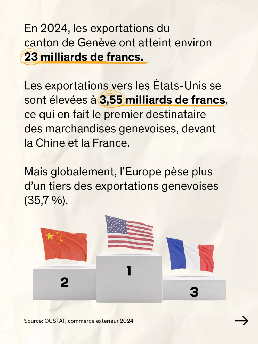 En 2024, les exportations du canton de Genève ont atteint environ 23 milliards de francs, selon l’Office cantonal de la statistique (OCSTAT), un léger recul de 0,9 % par rapport à 2023. Premier destinataire des marchandises genevoises : les États-Unis, avec 3,55 milliards de francs d’exportations, une hausse de 2,7% par rapport à l'année précédente. Les Etats-Unis se placent devant la Chine (3,12 milliards de francs) et la France (2 milliards de francs). Genève exporte bel et bien davantage vers les États-Unis que vers la Chine.