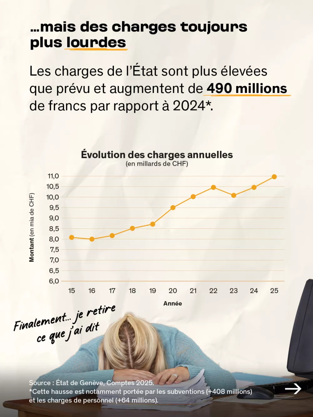 En parallèle, les dépenses poursuivent leur progression. Les charges de l’État augmentent de 490 millions de francs par rapport à 2024 et dépassent les prévisions budgétaires.