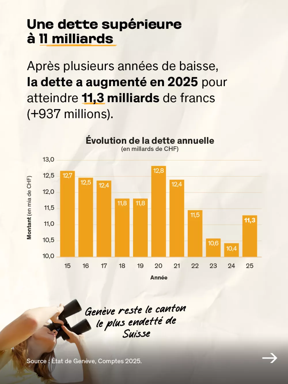 Après plusieurs années de recul, la dette genevoise augmente à nouveau. Elle atteint 11,3 milliards de francs à fin 2025, soit une hausse de 937 millions sur un an. Genève reste ainsi le canton le plus endetté de Suisse.