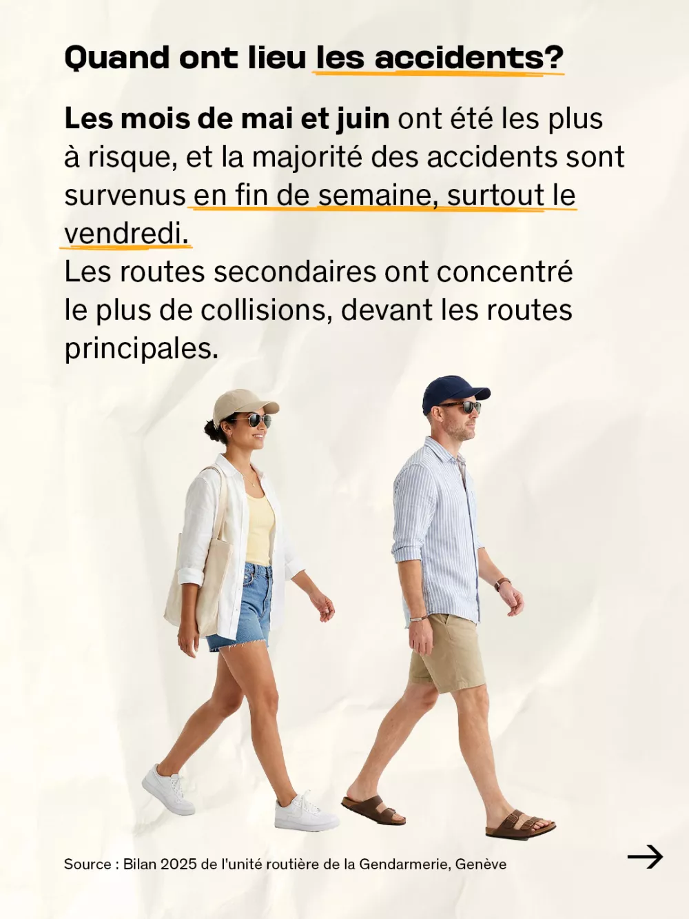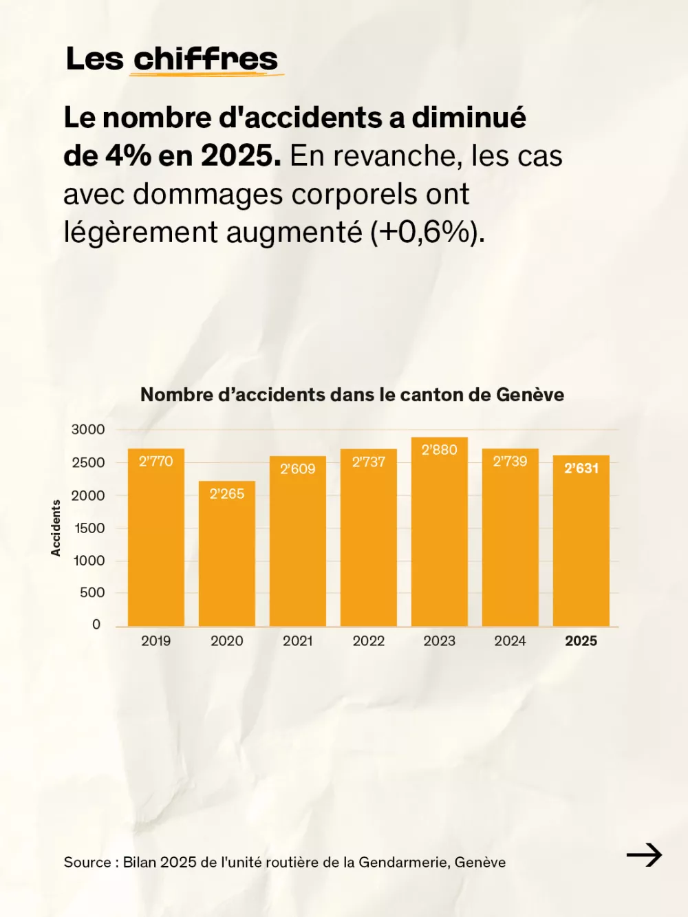 A Genève, le nombre d’accidents a diminué de 4% entre 2024 et 2025. Cette baisse est principalement due à de moins en moins de chocs causant des dommages matériels. En revanche, les accidents qui ont causé des blessures corporelles aux victimes sont en légère hausse, à +0,6%. Les décès quant à eux baissent pour la troisième année consécutive, après une hausse marquée en 2023.
