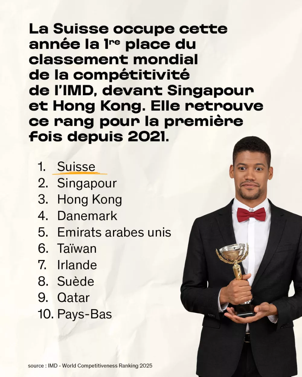 La Suisse reprend la 1ʳᵉ place mondiale de la compétitivité, devant Singapour et Hong Kong! Ses atouts? Sa stabilité politique et la solidité du franc, notamment. Mais attention l’équilibre reste fragile : la Suisse est seulement 6ᵉ en efficacité des entreprises et 13ᵉ en compétitivité macroéconomique.