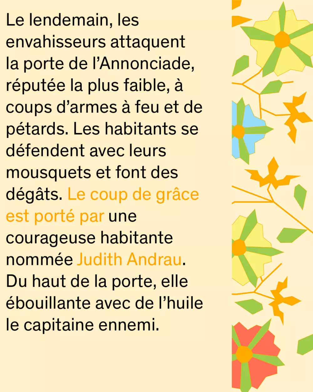 Et s'il y avait eu d'autres Escalades que celle de Genève? Dans le Sud de la France, en 1586, un baron et un duc tentent d'assiéger une ville, mais une courageuse habitante, Judith Andrau, va changer la trame de l'histoire. Son geste s'apparente à celui de la Mère Royaume en 1602 à Genève.