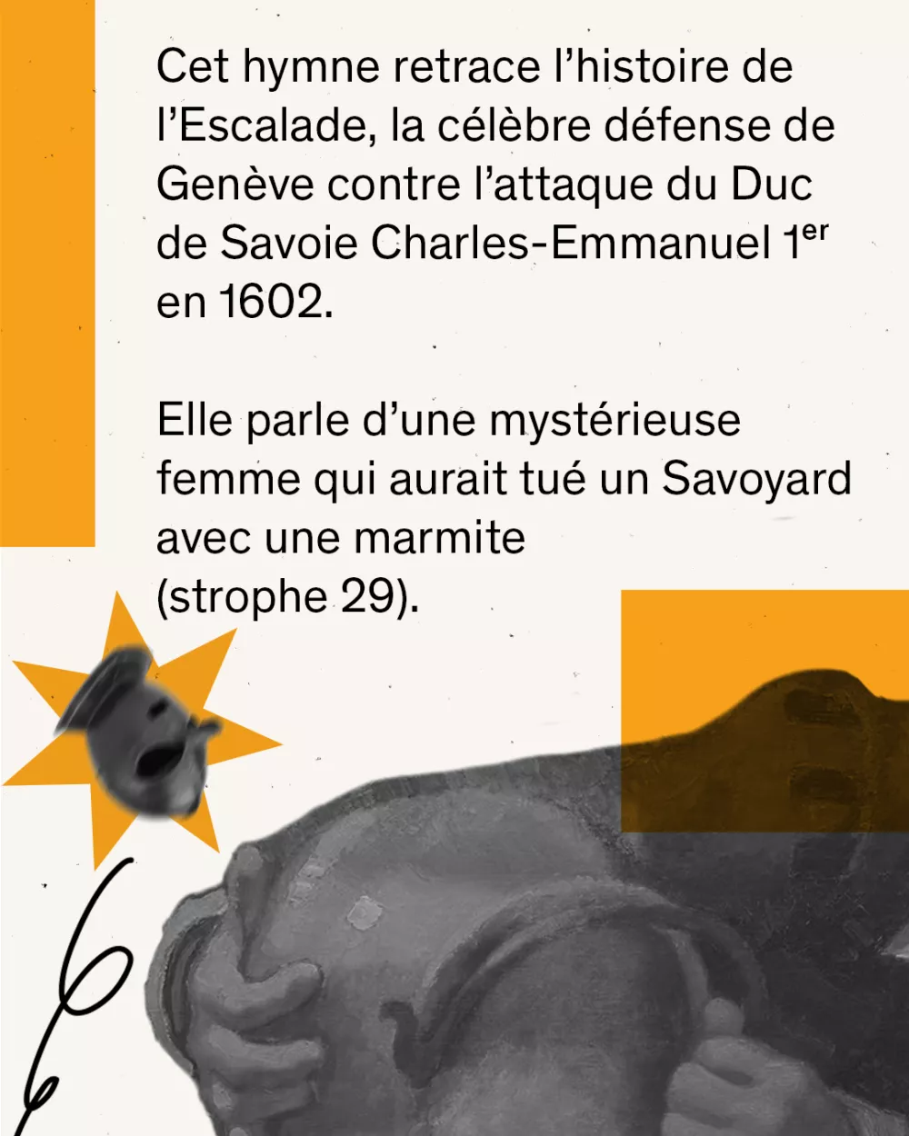 L'hymne retrace l'histoire de l'Escalade et un geste héroïque : celui d'une femme qui expédie sur un Savoyard un grand coup de marmite. Vous avez deviné? Il s'agit bien sûr de la Mère Royaume!
