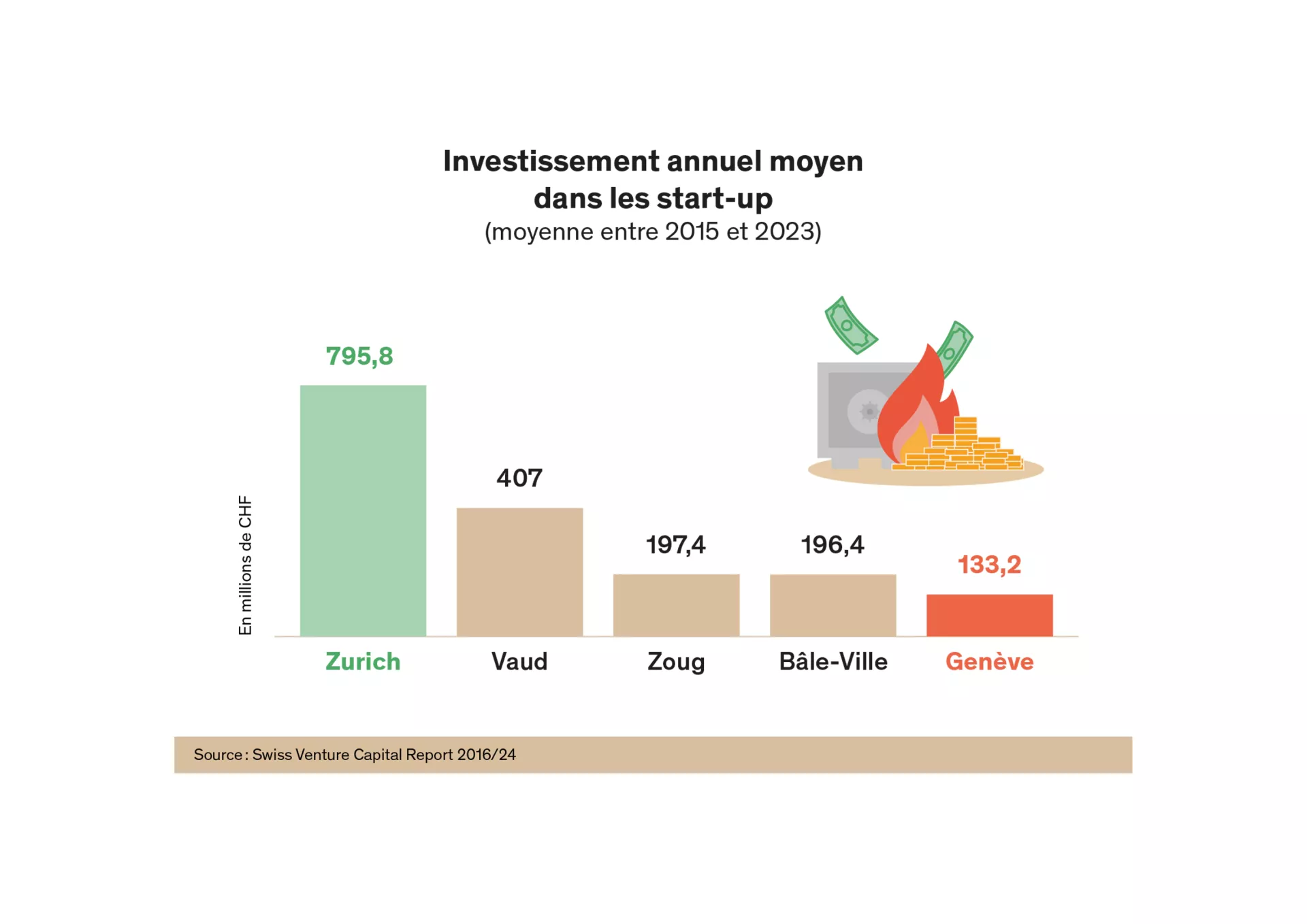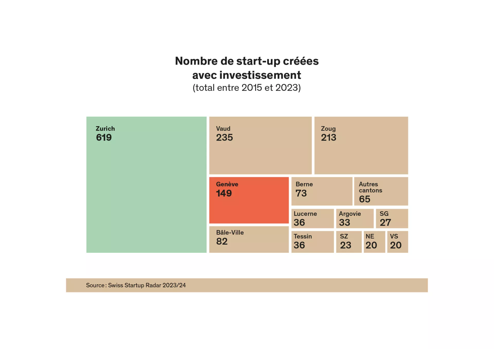 En termes de levées de fonds, Genève peine également à rivaliser avec ses concurrents. Entre 2015 et 2023, les start-up genevoises n’ont levé, en moyenne, que 133 millions de francs par an contre 796 millions pour les start-up zurichoises. Genève a du mal à attirer les investisseurs par comparaison aux autres grandes places économiques suisses, alors même que la capacité de lever des fonds est un pilier essentiel qui contribue fortement à la capacité d’innovation d’un canton. Sans soutien financier adéquat, il est difficile de promouvoir la recherche, et sans recherche, il n’y a ni progrès ni découvertes significatives. Ces écarts soulèvent ainsi d’importantes questions et réflexions quant à la manière d’optimiser le soutien à l’entrepreneuriat et à l’innovation à Genève.