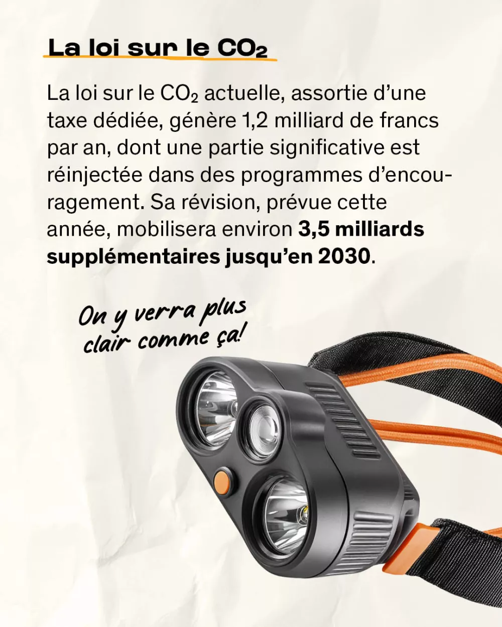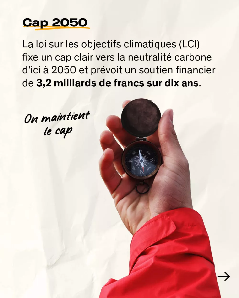 Au niveau fédéral, la loi sur les objectifs climatiques trace la trajectoire vers la neutralité carbone en 2050, avec un soutien étatique de 3,2 milliards sur dix ans pour accélérer cette transition. Elle s’ajoute à la loi sur le CO₂, qui génère chaque année environ 1,2 milliard grâce à une taxe directement liée aux émissions. Une grande partie de ces fonds revient dans des programmes d’encouragement : rénovation énergétique des bâtiments, innovation, mobilité propre, etc. La révision en cours de la loi CO₂ prévoit même 3,5 milliards supplémentaires d’ici 2030 afin d’accélérer encore le mouvement.