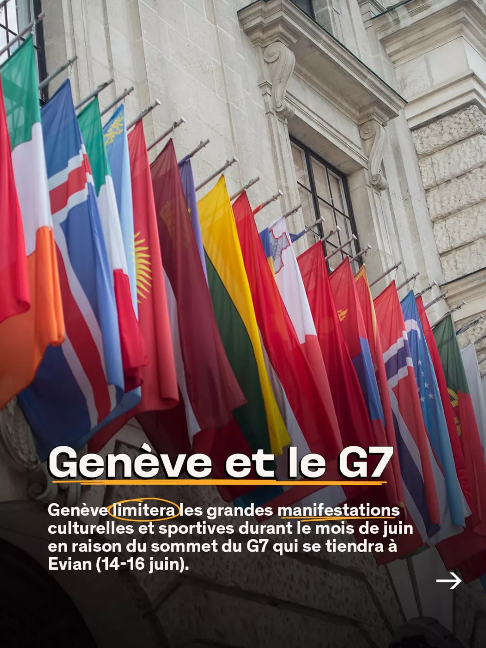 Enfin, la tenue du sommet du G7 à Evian (14-16 juin 2026) aura des répercussions sur la vie culturelle et sportive locale. Genève limitera certaines grandes manifestations durant le mois de juin afin de faciliter la sécurité et la logistique autour du sommet.