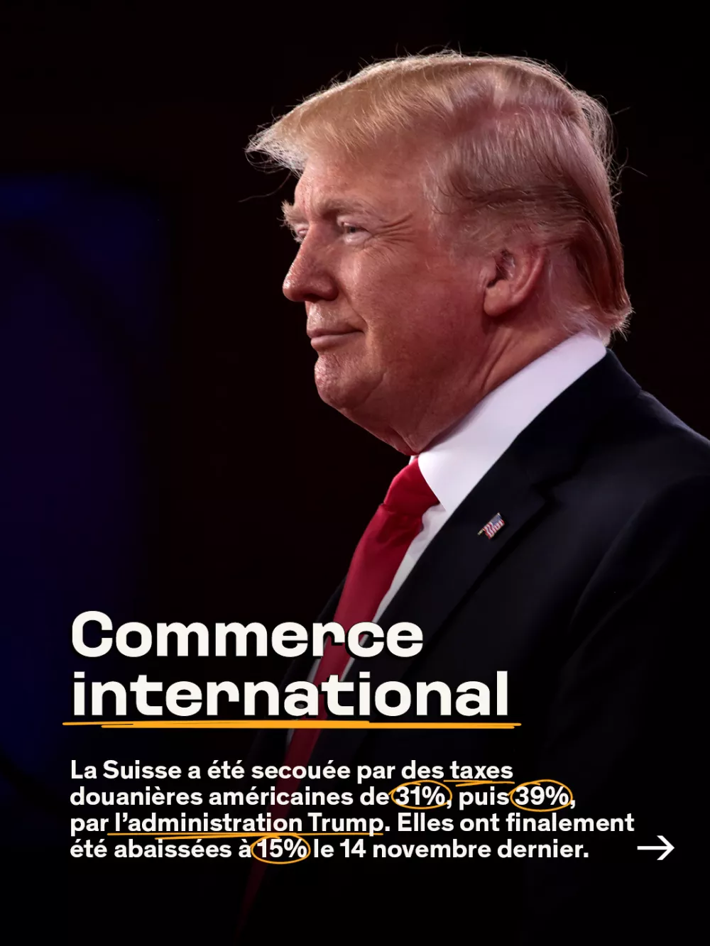 Sur le plan international, la Suisse a été secouée par des taxes douanières américaines de 31%, puis 39%, par l'administration Trump. Elles ont finalement été abaissées à 15% le 14 novembre dernier.