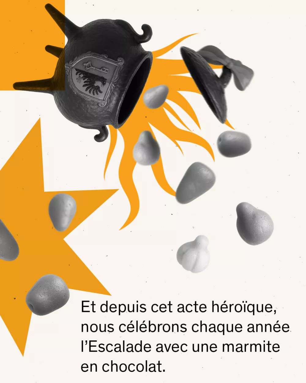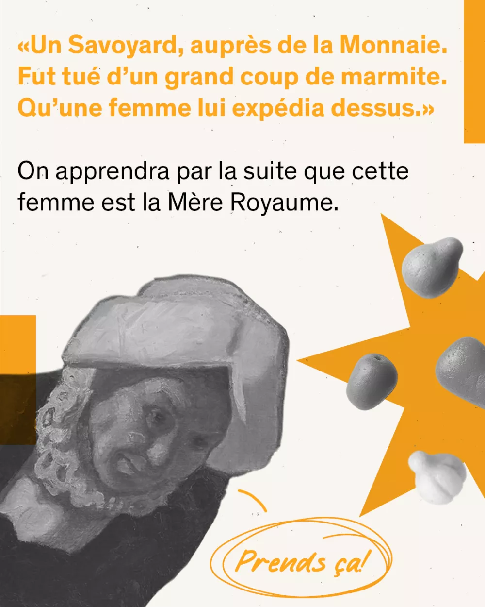 L'hymne retrace l'histoire de l'Escalade et un geste héroïque : celui d'une femme qui expédie sur un Savoyard un grand coup de marmite. Vous avez deviné? Il s'agit bien sûr de la Mère Royaume!