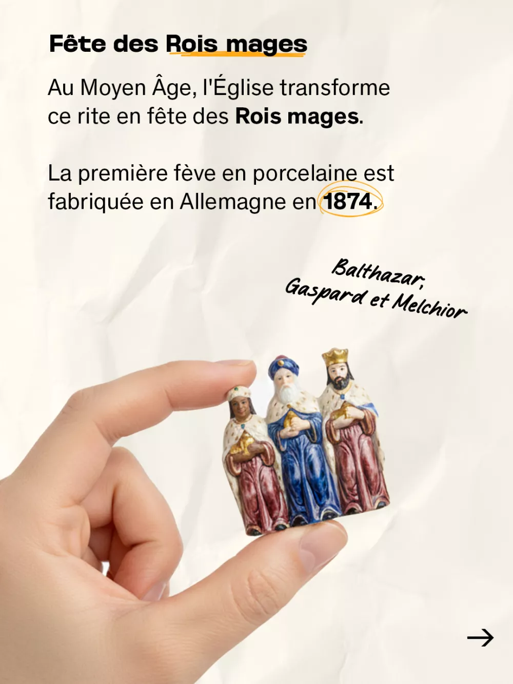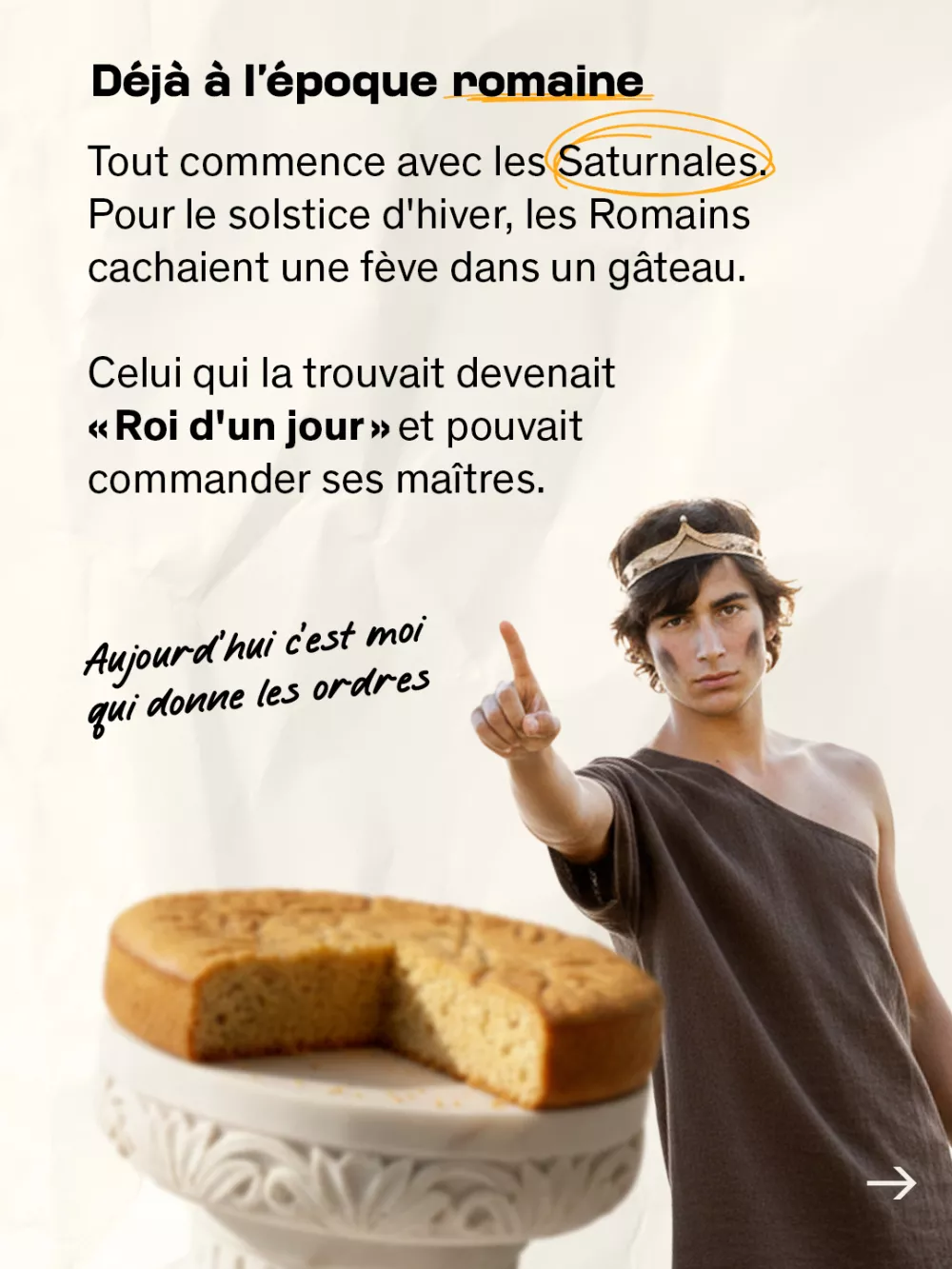 Tout commence avec les Saturnales. Pour le solstice d'hiver, les Romains cachaient une fève dans un gâteau. Celui qui la trouvait devenait « Roi d'un jour » et pouvait commander ses maîtres. Découvrez la suite de l'histoire dans notre carrousel !